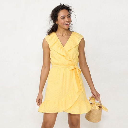 Discount Petite LC Lauren Conrad Ruffled Wrap Dress Yellow Puff Orange Gingham