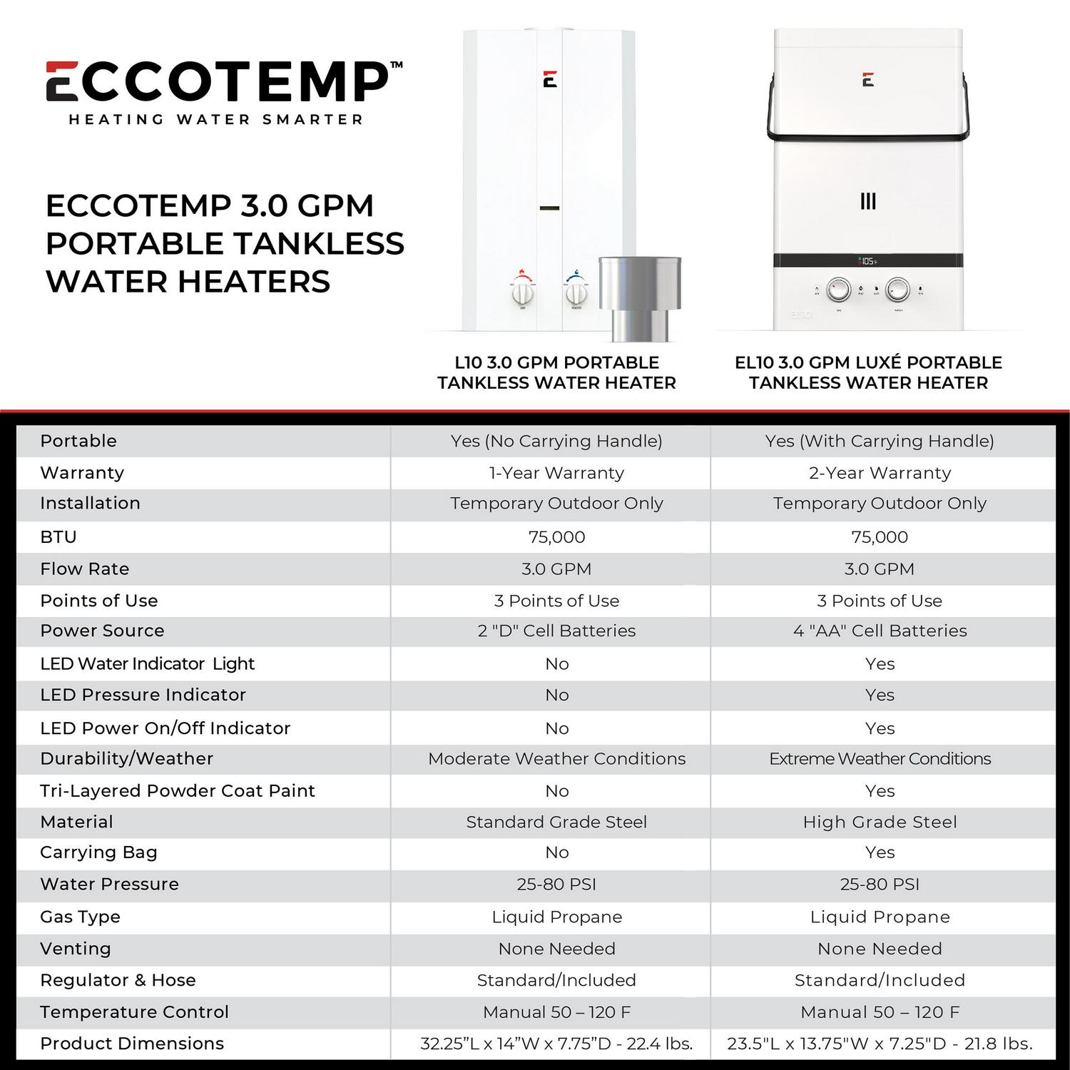 Eccotemp L10 Portable Tankless 3-GPM 75000-BTU Outdoor Liquid Propane Tankless Water Heater