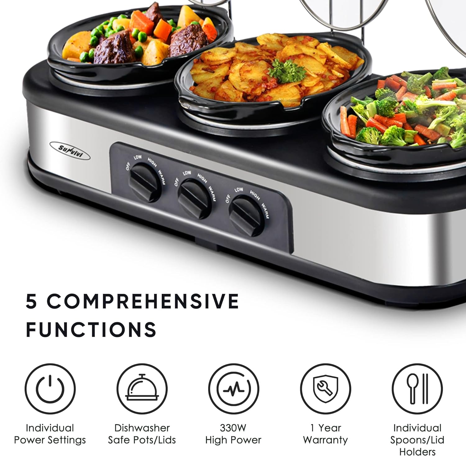 Sunvivi Triple Slow Cooker Buffet Server 3 Pot Food Warmer, 3-Section
