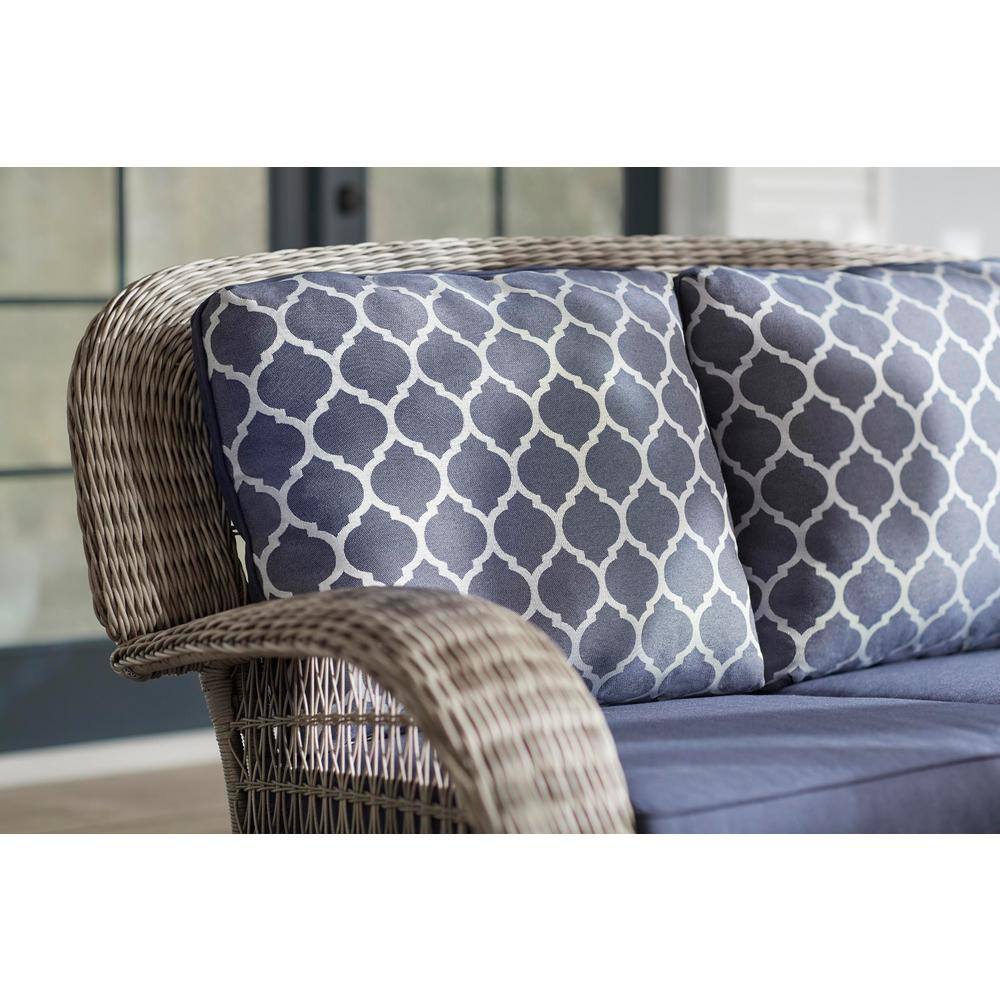 Hampton Bay Beacon Park Gray Wicker Outdoor Patio Loveseat with Standard Midnight Trellis Navy Blue Cushions